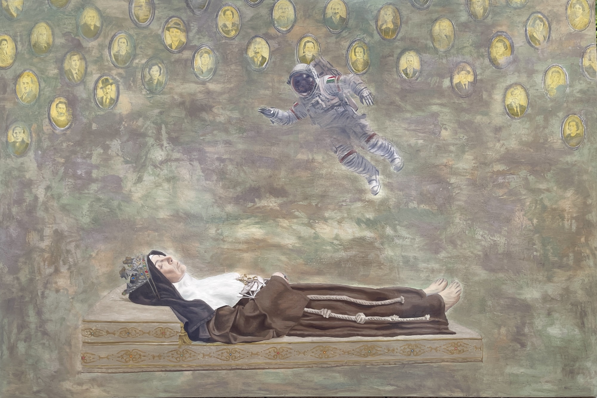 Dialogo onirico tra la Beata Mattia e un astronauta, 2024, 100 x150 cm, olio su tela
